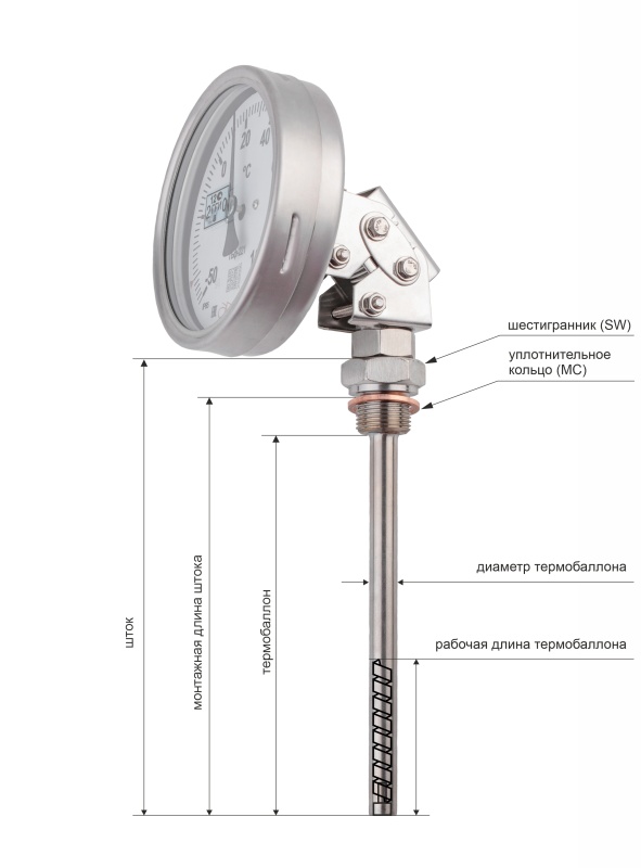 ВАЖНО! Корпус и шток (термобаллон) коррозионностойких термометров изготавливаются из нержавеющей стали, тип присоединения на штоке - фиксированная внутренняя резьба. При необходимости термометр комплектуется гильзой из нержавеющей стали с внешней резьбой присоединения к прибору.