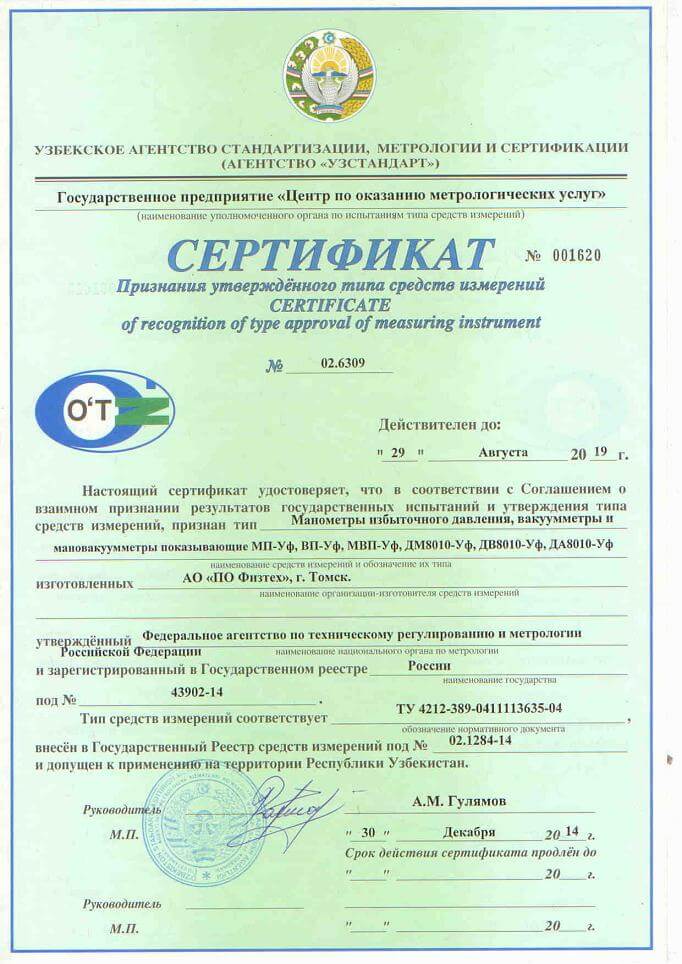 ДокументыОписание типа Размер: 6,2 мбCвидетельство об утв. типа (OC.C.30.092.A №58215) Размер: 344,5 кбДекларация о соответствии (ТР ТС 032) Размер: 612,5 кбСертификат соответствия (ТР ТС 032) Размер: 2,2 мбДСС ГОСТ ТУ Манометры ФТ Размер: 723,6 кб
